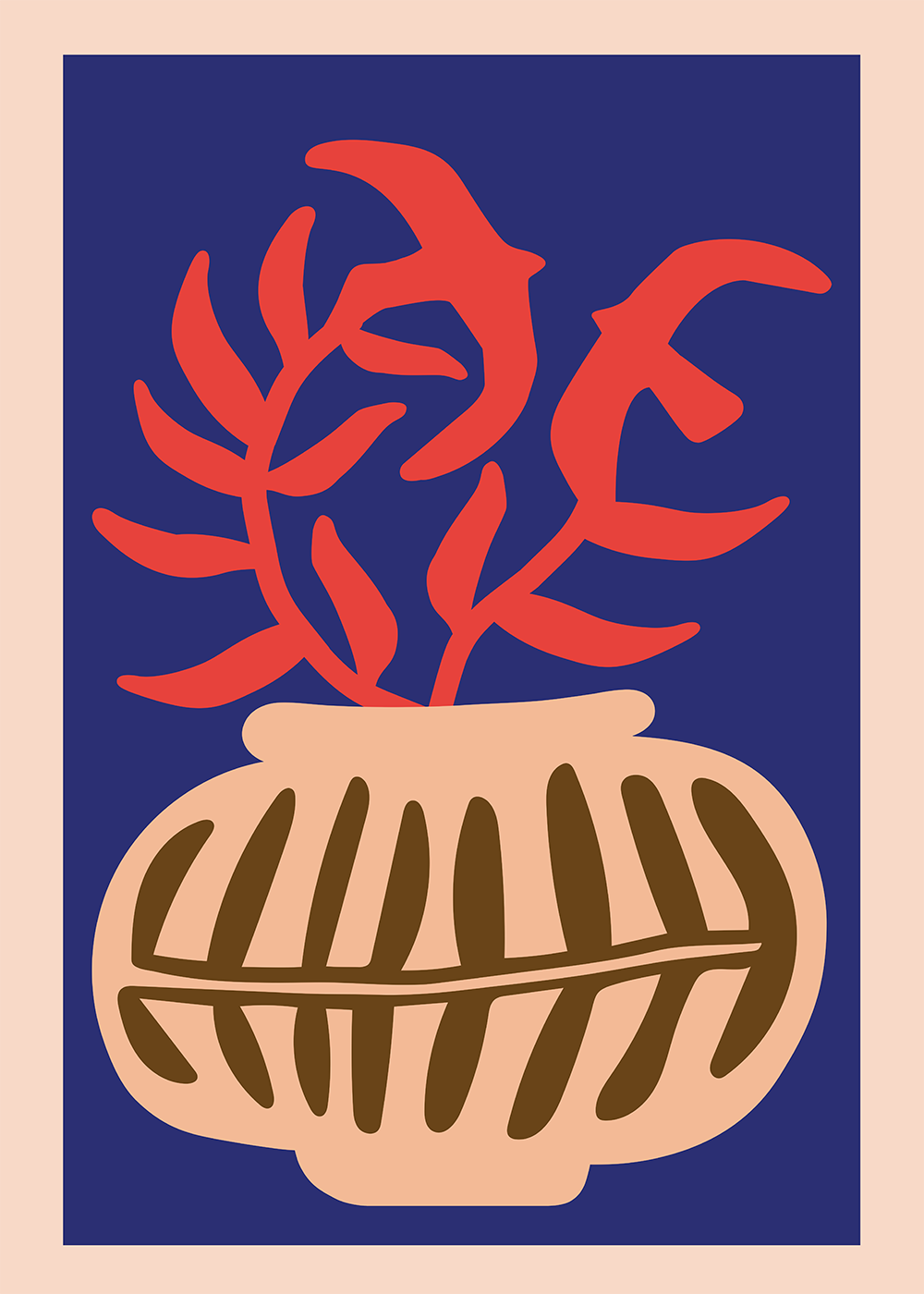 Abstracted forms and vibrant colours combine in Anne Olde Kalter’s Floral Wings. Two bright red flowers extend from a low, rounded vase, with two bird motifs appearing like flowers at the end of each stem. With a vase in shades of beige and brown, the red flowers punctuate the vibrant blue backdrop, expressing a composition that is a celebration of the artists love of nature, colour and freedom of expression.