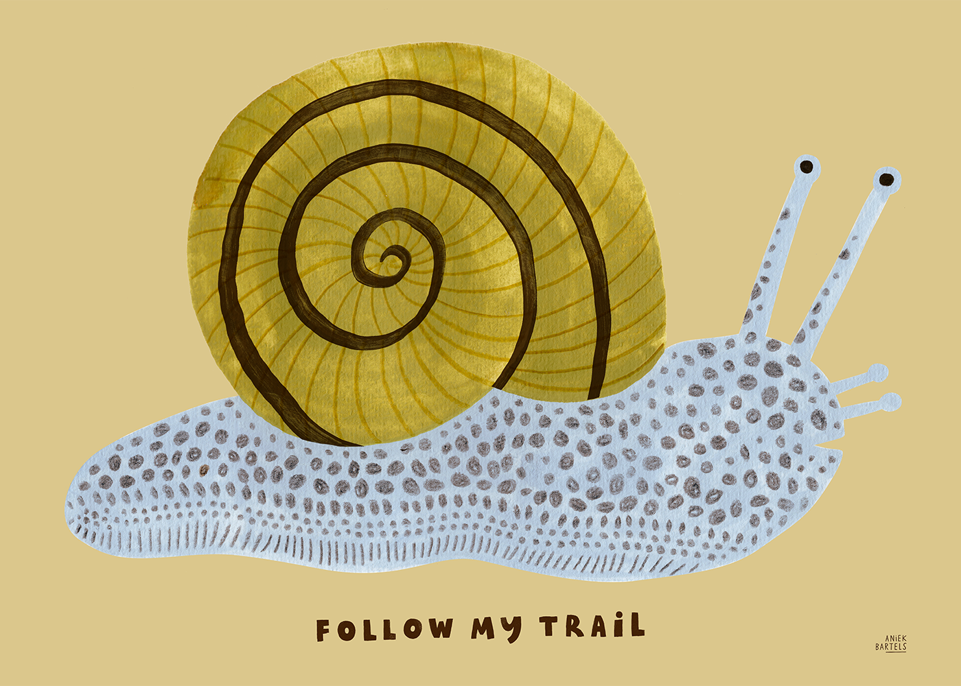 Inspired by tracing the slimy path of a snail, Follow My Trail by Dutch illustrator Aniek Bartels encourages us all to relax and go slow. A spotted blue body and twirling green shell creates a playful feeling to this calming composition.