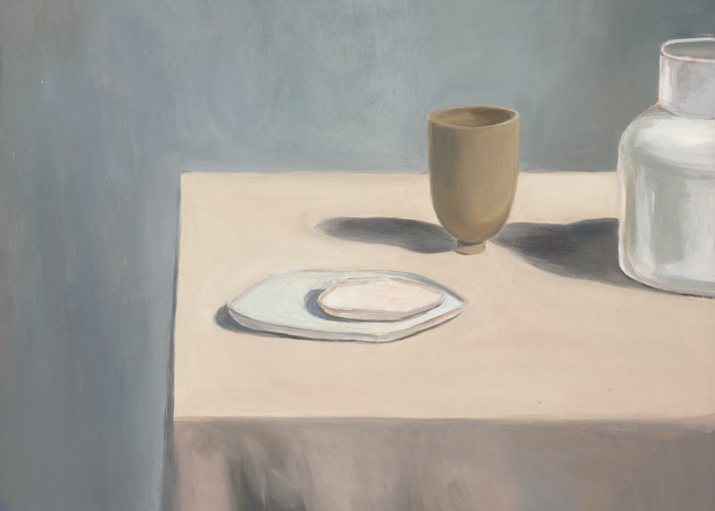 Prioritising colour and tone above form, On A Table by Swedish artist Jonna Valtner revolves around the harmonious use of calming yet textural rich tones. Set atop a tablecloth, a series of ceramic objects highlight tones of soft blue, beige and white, with a grey toned blue backdrop creating a rich setting.