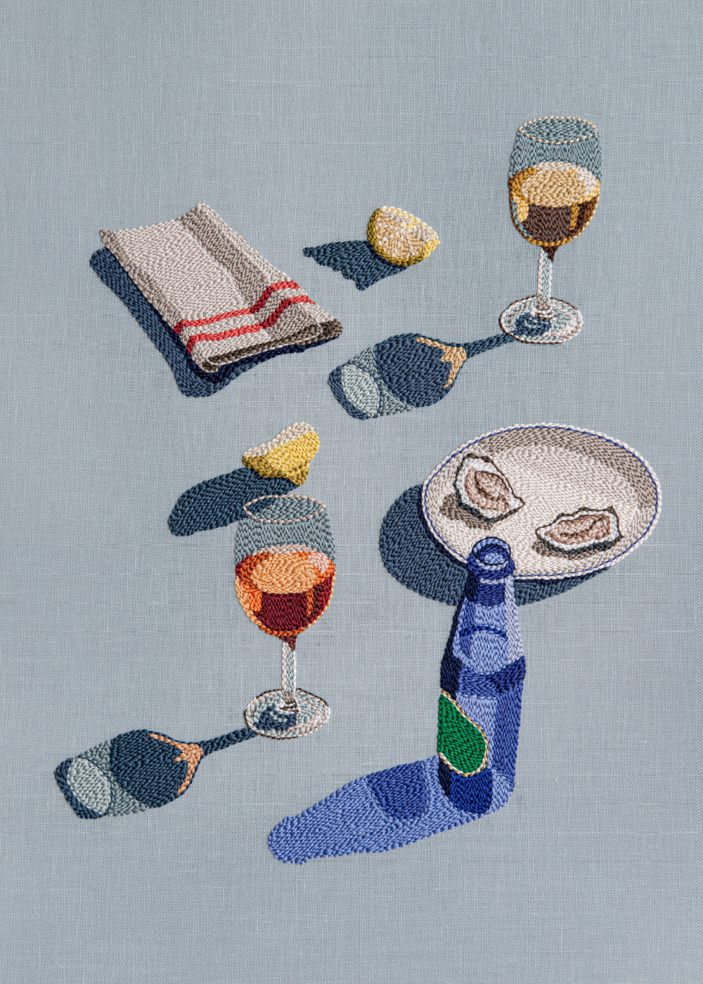 With her first collection for Paper Collective, Adrienna Matzeg captures the essence of hot afternoons, reflecting on the connection and joy that come from sharing drinks and snacks with others. The World is Your Oyster transforms her photography into intricate embroidery, the composition evoking a dreamlike nostalgia that preserve her snapshots in textile form.